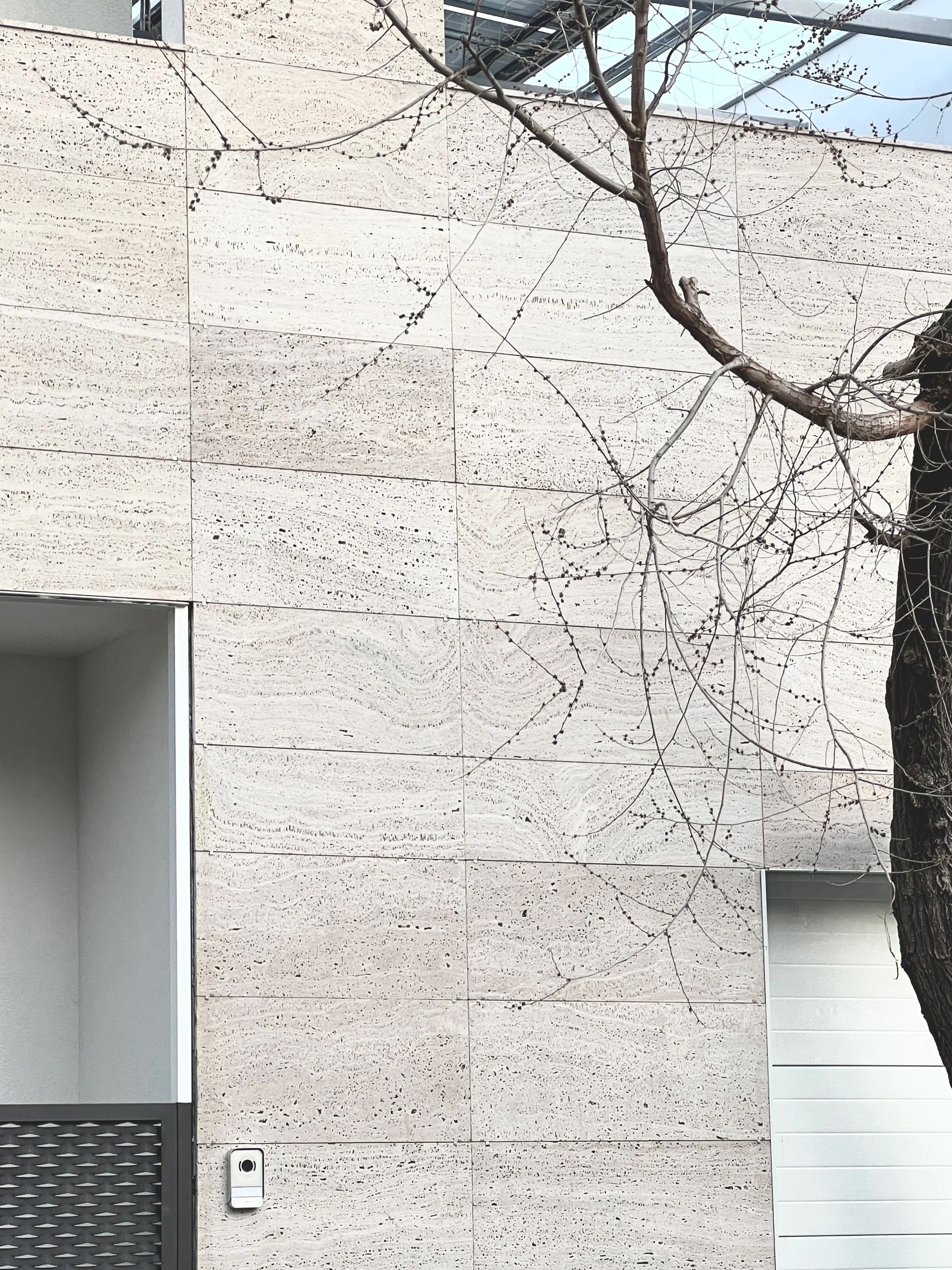 La versatilidad del Travertino Tierra le hace que sea útil tanto para fachada, como para pavimento.