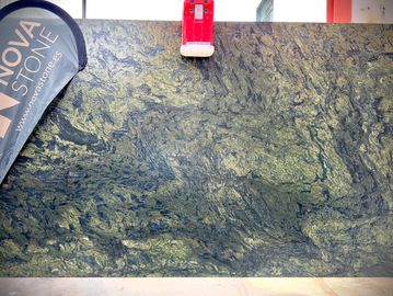 Una cuarcita con principalmente tonos verdes, donde las vetas y la combinación de colores rompe con la uniformidad y simula a la rugosidad de la piel del reptil..
