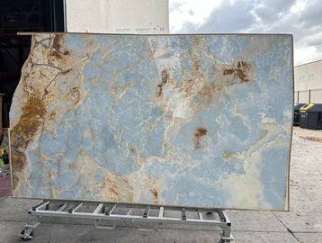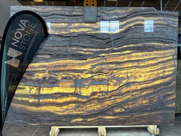 Elegante, exótico y salvaje. El protagonismo del dorado sobre el gris hace de este ónix una piedra singular y característica.